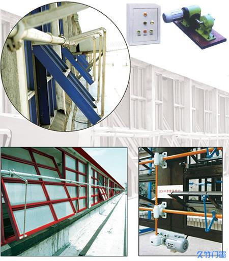 中悬钢天(侧)窗电动减速机和开窗机由同一机座连成一体水平安装时,用于启闭中悬钢天窗。用于启闭钢侧窗时,电动减速机装于中悬钢侧窗下部的墙壁上,为主动机构,此时开窗机分为上部和中部两部分,上部用于开启最高排窗扇,中部用于开启中间排窗扇。开窗的动力,由联动钢管传递,在开窗机的水平输出轴上装有传动钢管和开关器,开关器分别于窗扇相连接,从而实现窗扇的启闭,位置到达时由限位开关控制运行。在电动减速机蜗杆端装有手动装置,供停电时使用。