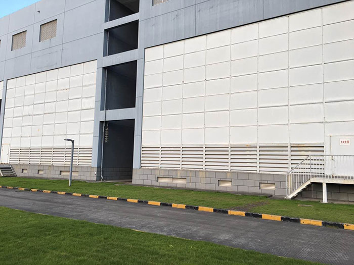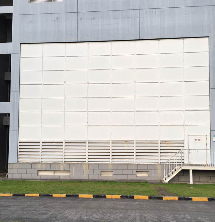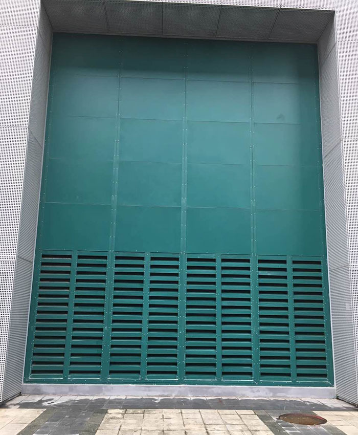大门模块板面板采用“舰用板”,外形美观大方。当用户有特殊要求时,可更换其它材料。设计工艺采取多种隔音措施,效果显著。模块板密封性能优良,重量轻,每平方米约30kg,表面光滑。模块板结构安全牢固,能承受120Pa风压强度。下部设有进风消声百叶窗,可增加主变室的进风量。